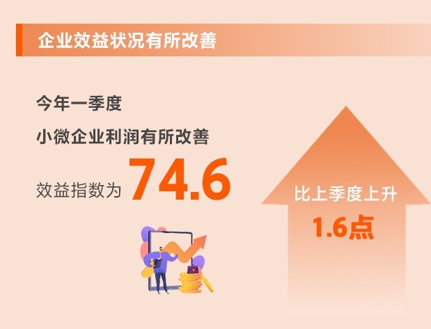 企業(yè)生產(chǎn)經(jīng)營加速恢復(fù),原材料價(jià)格漲幅收窄,以及延續(xù)優(yōu)化減稅降費(fèi)政策減輕企業(yè)負(fù)擔(dān),小微企業(yè)利潤有所改善。一季度,效益指數(shù)為74.6,比上季度上升1.6點(diǎn),反彈幅度較大,但仍處于歷史較低位。所調(diào)查的8個(gè)行業(yè)效益指數(shù)均有所上升。