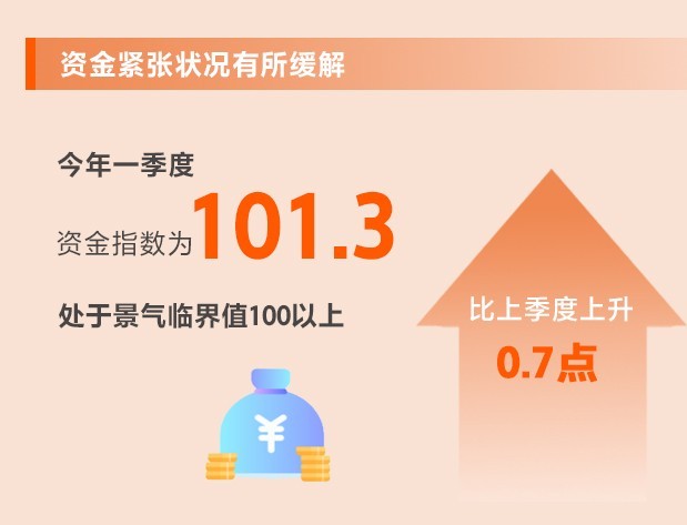 央行降準(zhǔn)以及指導(dǎo)金融機(jī)構(gòu)繼續(xù)支持小微企業(yè),多措并舉“精準(zhǔn)滴灌”,小微企業(yè)融資狀況不斷改善。一季度,資金指數(shù)為101.3,比上季度上升0.7點(diǎn),處于景氣臨界值100以上。其中,流動資金指數(shù)為86.3,比上季度上升1.1點(diǎn);融資指數(shù)為90.8,環(huán)比上升0.5點(diǎn)。所調(diào)查的8個(gè)行業(yè)中,8個(gè)行業(yè)流動資金指數(shù)、6個(gè)行業(yè)融資指數(shù)均上升。