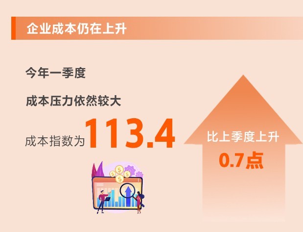 全球通脹仍處于高位,美聯(lián)儲急速加息對世界經(jīng)濟(jì)影響的外溢效應(yīng)持續(xù)顯現(xiàn)。中小企業(yè)多位于產(chǎn)業(yè)鏈下游且面對消費(fèi)者,需求疲弱情況下難以轉(zhuǎn)嫁上游原材料價(jià)格上漲的壓力,同時(shí)還面臨人力成本上行以及房屋租金較高等困難。一季度,成本指數(shù)為113.4,比上季度上升0.7點(diǎn),仍處于不景氣區(qū)間,說明成本壓力依然較大。所調(diào)查的8個(gè)行業(yè)中,7個(gè)行業(yè)生產(chǎn)成本指數(shù)、8個(gè)行業(yè)勞動力成本指數(shù)均上升。
