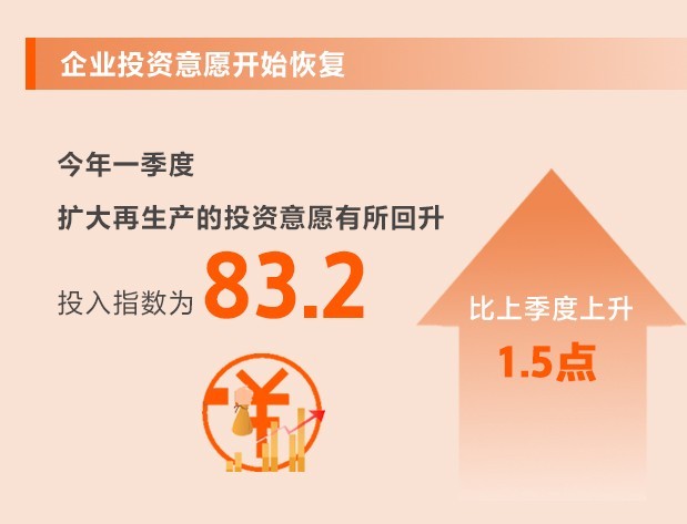各地投向基礎(chǔ)領(lǐng)域、短板領(lǐng)域、科技創(chuàng)新領(lǐng)域的項(xiàng)目和計(jì)劃增多,企業(yè)對未來的信心有所增強(qiáng),擴(kuò)大再生產(chǎn)的投資意愿有所回升。一季度,投入指數(shù)為83.2,比上季度上升1.5點(diǎn),所調(diào)查的8個(gè)行業(yè)投入指數(shù)均上升。