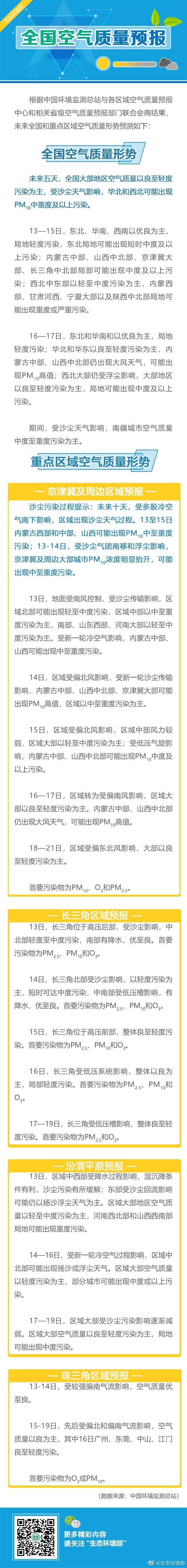 央視網消息:據@生態(tài)環(huán)境部 微博消息,未來五天(4月13—17日),全國大部地區(qū)空氣質量以良至輕度污染為主,受沙塵天氣影響,華北和西北可能出現(xiàn)PM10中重度及以上污染。