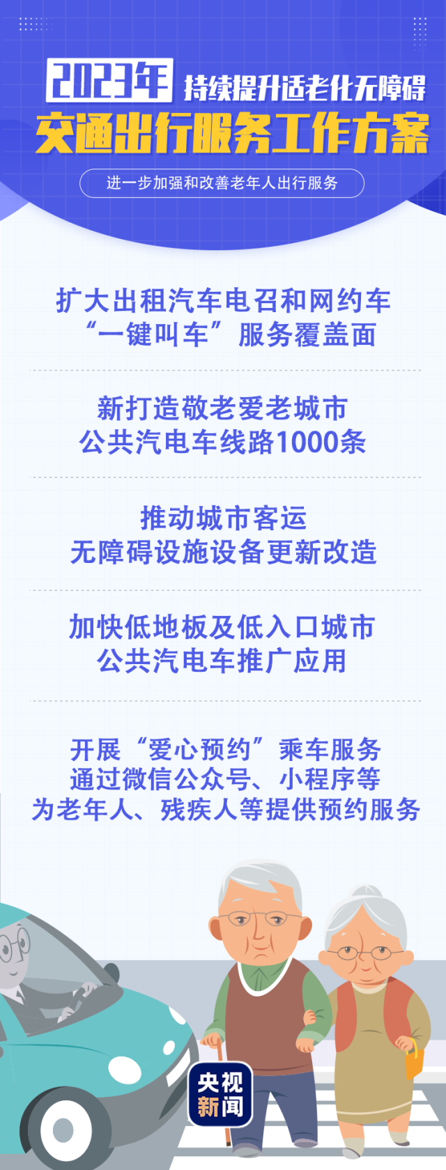 《2023年持續(xù)提升適老化無障礙交通出行服務(wù)工作方案》提出多項(xiàng)目標(biāo)任務(wù),滿足廣大老年人無障礙出行服務(wù)需要。