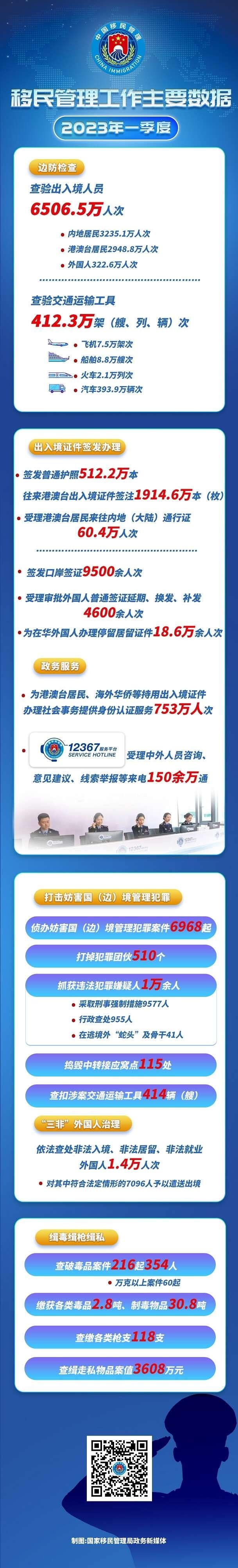 一季度,全國移民管理機構查驗交通運輸工具412.3萬架(艘、列、輛)次,其中飛機7.5萬架次,船舶8.8萬艘次,火車2.1萬列次,汽車393.9萬輛次;簽發(fā)普通護照512.2萬本、往來港澳臺出入境證件簽注1914.6萬本(枚),受理港澳臺居民來往內地(大陸)通行證60.4萬人次;簽發(fā)口岸簽證9500余人次,受理審批外國人普通簽證延期、換發(fā)、補發(fā)4600余人次,為在華外國人辦理停留居留證件18.6萬余人次;為港澳臺居民、海外華僑等持用出入境證件辦理社會事務提供身份認證服務753萬人次,12367服務平臺受理中外人員咨詢、意見建議、線索舉報等來電150余萬通。