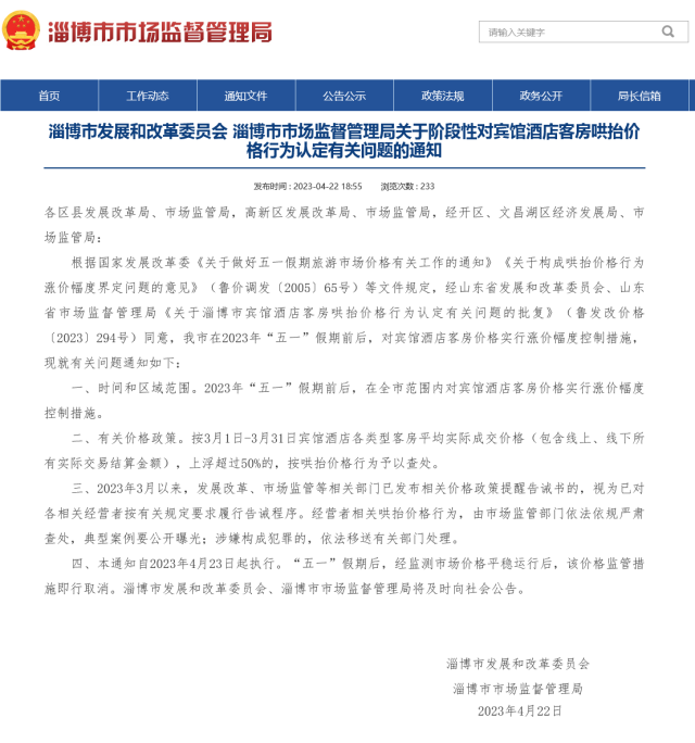 上浮超過(guò)50%,查處!淄博將對(duì)“五一”前后賓館酒店客房?jī)r(jià)格實(shí)行漲幅控制措施