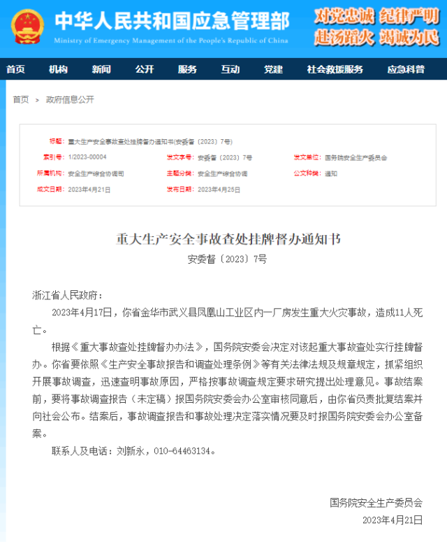 國(guó)務(wù)院安委會(huì)近日發(fā)布通知書(shū),決定對(duì)浙江金華一廠房重大火災(zāi)事故查處實(shí)行掛牌督辦。具體通知如下: