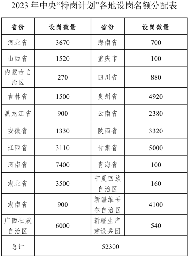 中國青年報客戶端北京4月25日電(中青報·中青網(wǎng)記者 樊未晨)記者今天從教育部獲悉,教育部辦公廳、財政部辦公廳近日聯(lián)合印發(fā)《關(guān)于做好2023年農(nóng)村義務(wù)教育階段學(xué)校教師特設(shè)崗位計劃實施工作的通知》,全國計劃招聘特崗教師52300名。