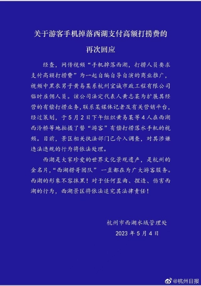 5月4日,杭州西湖水域管理處再次回應(yīng)“高價(jià)撈手機(jī)事件”:經(jīng)查,網(wǎng)傳視頻“手機(jī)掉落西湖,打撈人員要求支付高額打撈費(fèi)”為一起自編自導(dǎo)自演的商業(yè)推廣,視頻中黑衣男子黃易某系杭州宜誠(chéng)市政工程有限公司臨時(shí)雇傭人員。該公司法定代表人黃志某為擴(kuò)展其經(jīng)營(yíng)的有償打撈業(yè)務(wù),聯(lián)系某媒體記者及有關(guān)營(yíng)銷(xiāo)平臺(tái)經(jīng)過(guò)策劃,于5月2日下午組織黃易某等4人在西湖西冷橋等地拍攝了替“游客”有償打撈落水手機(jī)的視頻。目前,景區(qū)相關(guān)執(zhí)法部門(mén)已介入調(diào)查,對(duì)其涉嫌違法違規(guī)的行為將依法處理。西湖是大家珍愛(ài)的世界文化景觀遺產(chǎn),是杭州的金名片,“西湖撈哥團(tuán)隊(duì)”一直都在為廣大游客服務(wù)。西湖的形象不容抹黑!對(duì)于任何歪曲、捏造、傷害西湖的行為,西湖景區(qū)將依法追究其法律責(zé)任!