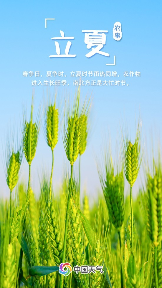 如果說(shuō)春是生的季節(jié),那么夏就是長(zhǎng)的季節(jié)?!稓v書》曰:“斗指東南,維為立夏,萬(wàn)物至此皆長(zhǎng)大,故名立夏也?!绷⑾模菢?biāo)示萬(wàn)物進(jìn)入旺季生長(zhǎng)的一個(gè)重要節(jié)氣。此時(shí),日照增加、氣溫漸升、雷雨增多,農(nóng)作物進(jìn)入了茁壯成長(zhǎng)階段。春播作物漸漸長(zhǎng)大,夏收作物進(jìn)入生長(zhǎng)后期,冬小麥揚(yáng)花灌漿,油菜接近成熟,大江南北都進(jìn)入了農(nóng)事繁忙時(shí)期。