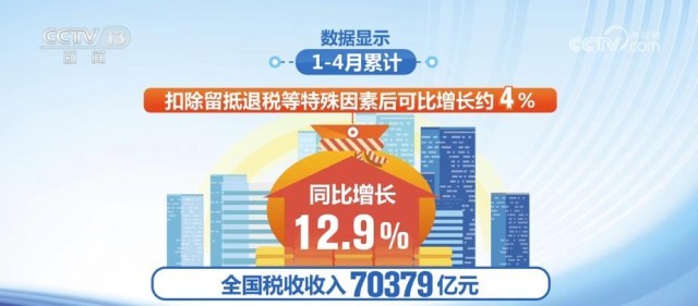 數(shù)據(jù)顯示,1月—4月累計(jì),全國(guó)稅收收入70379億元,同比增長(zhǎng)12.9%,扣除留抵退稅等特殊因素后可比增長(zhǎng)約4%。