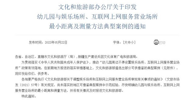 為貫徹落實(shí)《中華人民共和國(guó)未成年人保護(hù)法》,推動(dòng)“幼兒園周邊不得設(shè)置娛樂(lè)場(chǎng)所、互聯(lián)網(wǎng)上網(wǎng)服務(wù)營(yíng)業(yè)場(chǎng)所”政策有效落地,在前期地方報(bào)送的落實(shí)舉措基礎(chǔ)上,文化和旅游部遴選出部分可供借鑒的典型案例(見(jiàn)附件),現(xiàn)印發(fā)給你們,供參考。