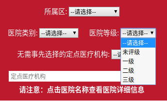 同時(shí)可選擇所屬區(qū)、醫(yī)院類(lèi)別(定點(diǎn)中醫(yī)醫(yī)院、定點(diǎn)專(zhuān)科醫(yī)院、對(duì)外綜合等醫(yī)院等)、醫(yī)院等級(jí),或輸入定點(diǎn)醫(yī)院名稱(chēng)進(jìn)行詳細(xì)查詢(xún)。