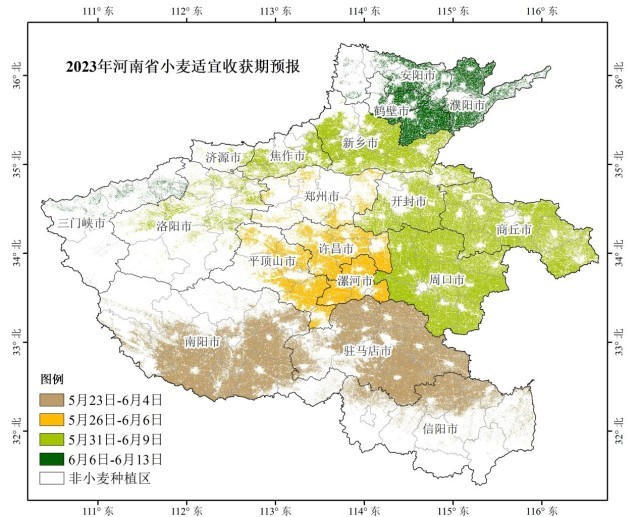 根據(jù)河南省氣象臺(tái)早前發(fā)布的消息,今年我省小麥適宜收獲期預(yù)計(jì)在5月23日-6月13日,大部地區(qū)接近常年,豫南地區(qū)略提前。其中:信陽(yáng)、南陽(yáng)、駐馬店適宜收獲期在5月23日-6月4日;漯河、平頂山、許昌、鄭州適宜收獲期在5月26日-6月6日;周口、商丘、開(kāi)封、新鄉(xiāng)、焦作、洛陽(yáng)、濟(jì)源適宜收獲期在5月31日-6月9日;三門峽、鶴壁、濮陽(yáng)、安陽(yáng)適宜收獲期在6月6日-13日。
