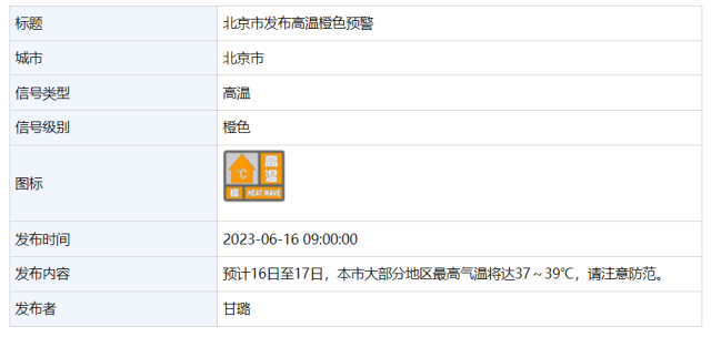 北京市氣象臺今天(16日)9時升級發(fā)布高溫橙色預(yù)警信號:預(yù)計16日至17日,北京市大部分地區(qū)最高氣溫將達(dá)37~39℃,請注意防范。