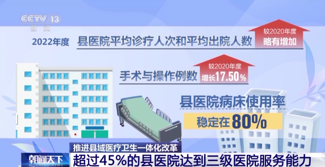 國(guó)家衛(wèi)生健康委日前通報(bào)的《2021-2022年度縣醫(yī)院醫(yī)療服務(wù)能力評(píng)估情況》顯示,截至2022年底,超過87%的縣醫(yī)院達(dá)到了二級(jí)醫(yī)院服務(wù)能力,超過45%的縣醫(yī)院達(dá)到了三級(jí)醫(yī)院服務(wù)能力。