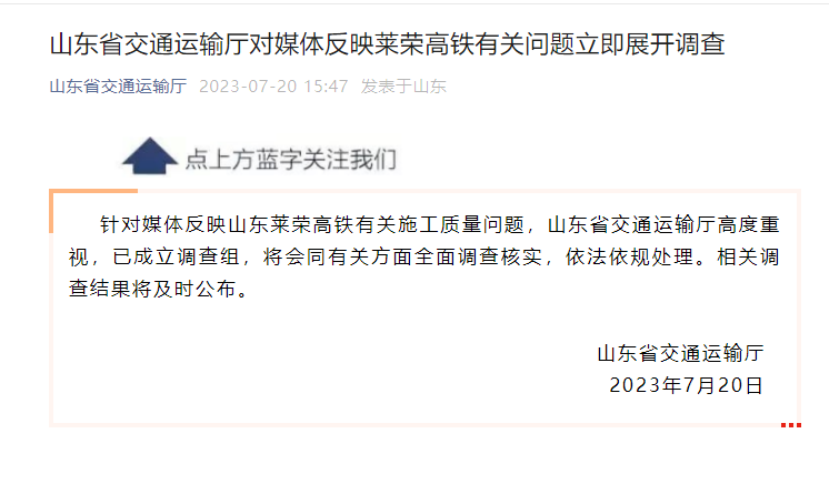 山東省交通運輸廳:對媒體反映萊榮高鐵有關(guān)問題立即展開調(diào)查