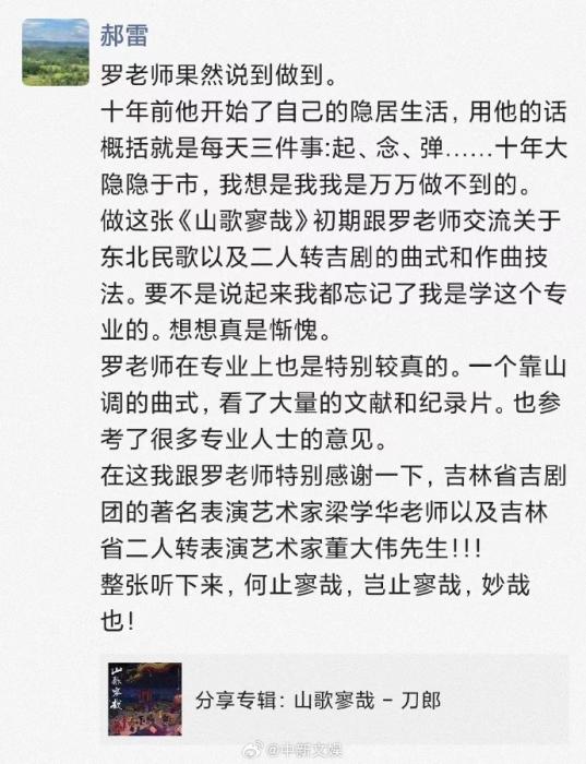 “整張聽下來,何止寥哉,豈止寥哉,妙哉也!”《山歌寥哉》發(fā)布當(dāng)天,刀郎好友、著名音樂人郝雷就在朋友圈發(fā)文夸贊。