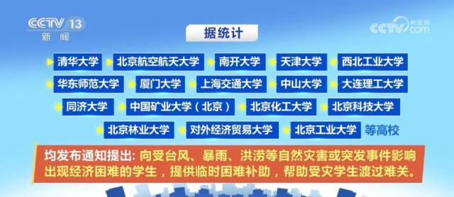 據(jù)統(tǒng)計(jì),清華大學(xué)、北京航空航天大學(xué)、南開大學(xué)、天津大學(xué)、西北工業(yè)大學(xué)、華東師范大學(xué)、廈門大學(xué)、上海交通大學(xué)、中山大學(xué)、大連理工大學(xué)、同濟(jì)大學(xué)、中國礦業(yè)大學(xué)(北京)、北京化工大學(xué)、北京科技大學(xué)、北京林業(yè)大學(xué)、對(duì)外經(jīng)濟(jì)貿(mào)易大學(xué)、北京工業(yè)大學(xué)等高校均發(fā)布通知提出,向受臺(tái)風(fēng)、暴雨、洪澇等自然災(zāi)害或突發(fā)事件影響出現(xiàn)經(jīng)濟(jì)困難的學(xué)生,提供臨時(shí)困難補(bǔ)助,幫助受災(zāi)學(xué)生渡過難關(guān)。