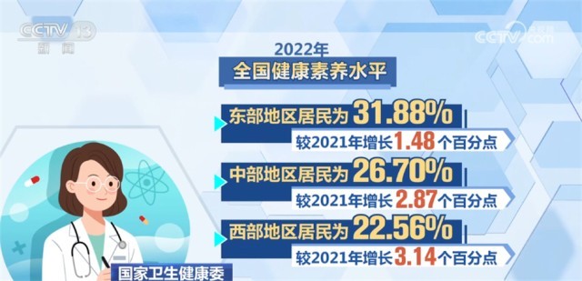 監(jiān)測結(jié)果顯示,2022年,全國城市居民健康素養(yǎng)水平為31.94%,農(nóng)村居民為23.78%,較2021年分別增長1.24和1.76個百分點(diǎn)。東、中、西部地區(qū)居民健康素養(yǎng)水平分別為31.88%、26.70%和22.56%,較2021年分別增長1.48、2.87和3.14個百分點(diǎn)。城鄉(xiāng)居民基本知識和理念素養(yǎng)水平為41.26%,健康生活方式與行為素養(yǎng)水平為30.63%,基本技能素養(yǎng)水平為26.00%,較2021年分別提升3.60、2.58、1.72個百分點(diǎn)。