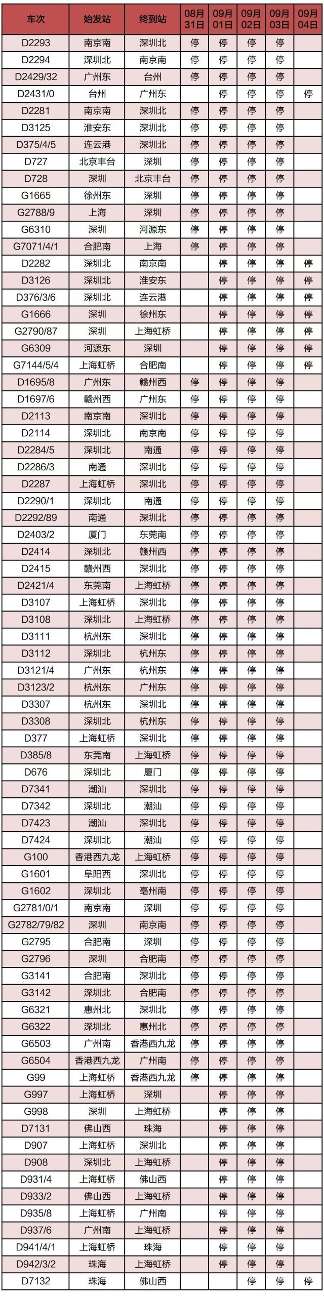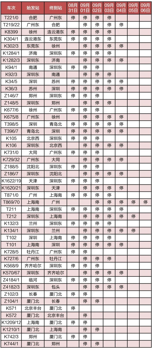 “長三角鐵路”消息:受第9號臺風“蘇拉”影響,為確保列車運行安全,鐵路部門計劃對杭深線、京港高鐵、廣深城際、廣深港高鐵、穗深城際、京九線等線路運行的部分列車采取停運措施,計劃停運8月31日至9月6日間共121趟旅客列車:其中停運動車組列車74趟,停運普速列車47趟。(停運列車車次信息見附表)