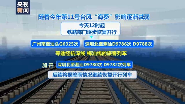 隨著今年第11號臺風“海葵”影響逐漸減弱,5日12時起,鐵路部門逐步恢復開行廣州南至汕頭G6325次、深圳北至潮汕D9786次、D9788次等途經(jīng)杭深線、梅汕線的旅客列車,加開深圳北至潮汕D9780次、D9782次列車。后續(xù)將視降雨情況,繼續(xù)恢復開行列車。