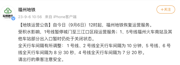 福州地鐵9月6日12時(shí)起恢復(fù)運(yùn)營服務(wù)