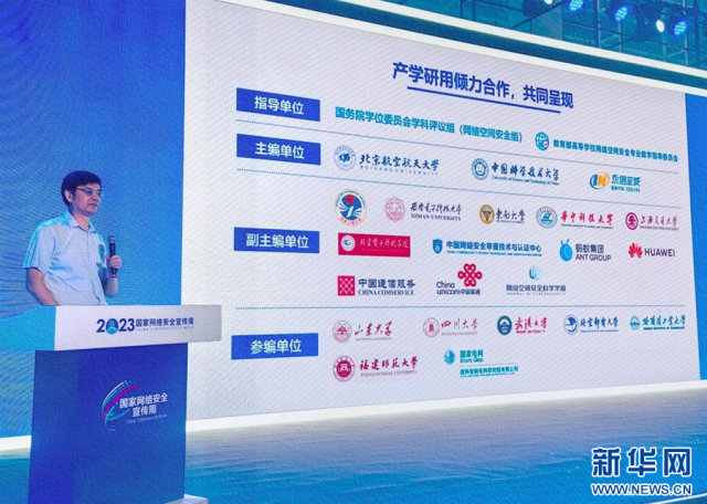 教育部高等學(xué)校網(wǎng)絡(luò)空間安全專業(yè)教學(xué)指導(dǎo)委員會副主任委員、中國科學(xué)技術(shù)大學(xué)網(wǎng)絡(luò)安全學(xué)院執(zhí)行院長俞能海在現(xiàn)場發(fā)布白皮書。新華網(wǎng)發(fā)(主辦方供圖)
