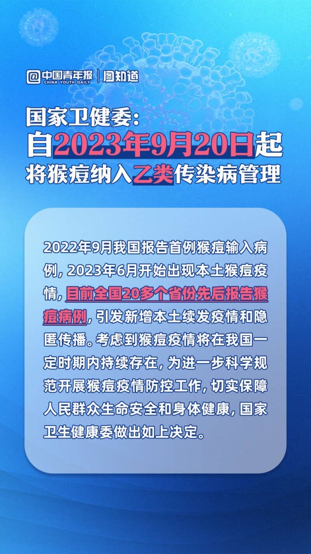 今年以來,我國已有20多個(gè)省份先后報(bào)告猴痘病例,引發(fā)新增本土續(xù)發(fā)疫情和隱匿傳播。國家衛(wèi)健委9月15日發(fā)布公告稱,自2023年9月20日起將猴痘納入乙類傳染病進(jìn)行管理,采取乙類傳染病的預(yù)防、控制措施。