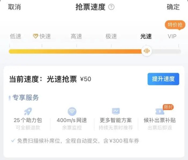 此外,許多第三方平臺(tái)推出搶票加速服務(wù)。例如,某平臺(tái)實(shí)行階梯服務(wù)及價(jià)位,速度從快速、高速、極速、光速到VIP,分別提供5-40個(gè)“助力包”,網(wǎng)速為200-500m/s,價(jià)格從10-80元不等,平臺(tái)會(huì)贈(zèng)送助力包,也可通過(guò)邀請(qǐng)好友獲取。該平臺(tái)還推出專人搶票功能,使用該功能可以24小時(shí)不間斷、通過(guò)更多渠道搶票,提高搶票成功率,價(jià)格為30元。此外,搶靠窗、過(guò)道的位置需另外加價(jià)。