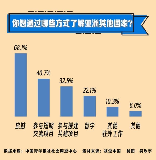 你會通過什么方式了解亞洲?68.1%的受訪者選擇了旅游,40.7%的受訪者選擇參與短期交流項(xiàng)目,32.5%的受訪者選擇參與援建共建項(xiàng)目,其他還有留學(xué)(22.1%)、駐外工作(10.3%)。