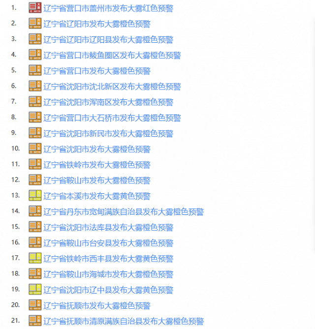 央視網(wǎng)消息:據(jù)“遼寧發(fā)布”微信公眾號消息,10月10日早晨,遼沈大地被大霧籠罩。截至目前,除遼西地區(qū)外,遼寧省內(nèi)大部分地區(qū)已陸續(xù)發(fā)布大霧橙色預警,其中營口蓋州已發(fā)布大霧紅色預警,最低能見度已低至50米以下。