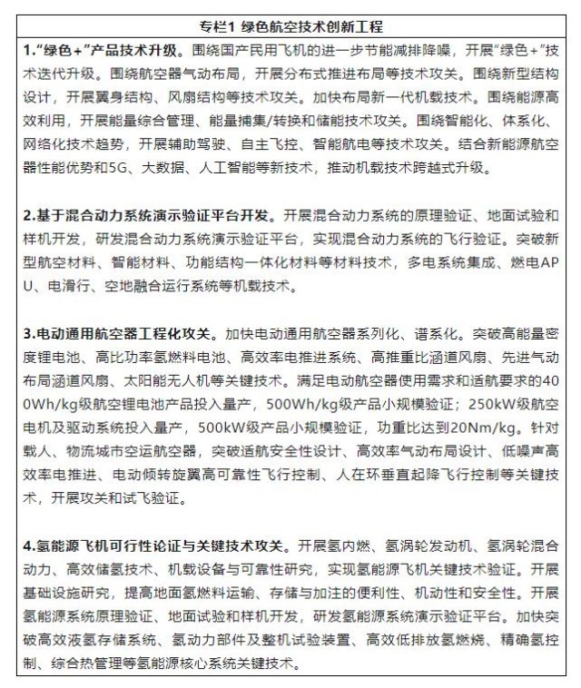 1.強(qiáng)化綠色航空關(guān)鍵核心技術(shù)攻關(guān)。持續(xù)推動(dòng)總體、氣動(dòng)、結(jié)構(gòu)、發(fā)動(dòng)機(jī)、機(jī)載、材料、制造工藝等領(lǐng)域技術(shù)升級(jí)換代,加速發(fā)展混合動(dòng)力推進(jìn)系統(tǒng),不斷提升干支線飛機(jī)、通用航空器節(jié)能減排降噪水平。加快發(fā)展高能量密度、高放電效率、高安全性的航空動(dòng)力電池技術(shù),以及高可靠性、高功重比、高效率的航空電推進(jìn)技術(shù)。加強(qiáng)高效燃?xì)鉁u輪-電能融合技術(shù)研究。引導(dǎo)優(yōu)勢企業(yè)和研究機(jī)構(gòu)持續(xù)突破智能化、高可靠性、輕量化、低成本能量控制和飛行控制技術(shù),開展新能源飛機(jī)總體設(shè)計(jì)、能源系統(tǒng)設(shè)計(jì)、全電機(jī)載系統(tǒng)等技術(shù)攻關(guān)。持續(xù)探索氫燃料存儲(chǔ)技術(shù)、氫燃料電池技術(shù)、氫內(nèi)燃、氫渦輪發(fā)動(dòng)機(jī)技術(shù)、氫渦輪混合電推進(jìn)技術(shù)、能量綜合管理技術(shù)等氫能源飛機(jī)關(guān)鍵技術(shù)。面向國家綠色航空發(fā)展的戰(zhàn)略需要,加快布局基礎(chǔ)研究和應(yīng)用基礎(chǔ)研究,解決制約綠色航空發(fā)展的源頭和底層技術(shù)問題。