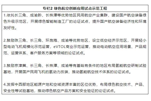 7.推動(dòng)新能源航空器區(qū)域應(yīng)用試點(diǎn)示范。依托優(yōu)勢地區(qū),建設(shè)國產(chǎn)航空裝備綠色升級(jí)示范區(qū)。鼓勵(lì)各地區(qū)結(jié)合區(qū)域經(jīng)濟(jì)發(fā)展基礎(chǔ)和需求,開展電動(dòng)通航飛機(jī)、eVTOL試點(diǎn)示范應(yīng)用,探索技術(shù)和裝備體系、應(yīng)用場景、商業(yè)運(yùn)營新模式。鼓勵(lì)有基礎(chǔ)有條件的地區(qū)布局綠色航空關(guān)鍵技術(shù)、產(chǎn)品方案、安全驗(yàn)證等試驗(yàn)基地。