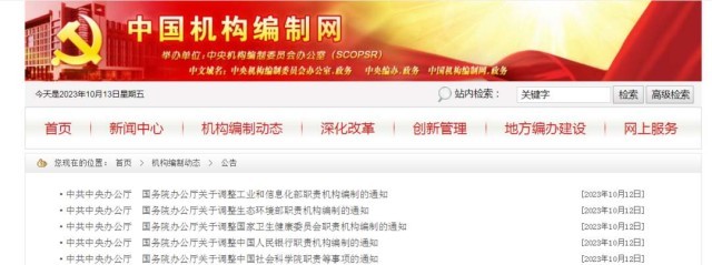 中國機(jī)構(gòu)編制網(wǎng)12日消息,中共中央辦公廳、國務(wù)院辦公廳日前發(fā)布相關(guān)通知,調(diào)整工業(yè)和信息化部、生態(tài)環(huán)境部、國家衛(wèi)生健康委員會(huì)、中國人民銀行職責(zé)機(jī)構(gòu)編制,調(diào)整中國社會(huì)科學(xué)院職責(zé)等事項(xiàng)。