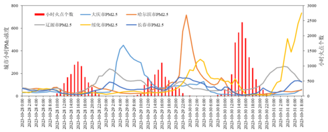 專(zhuān)家表示,東北地區(qū)秸稈焚燒高峰期集中在每天12-18時(shí),其中10月30日15時(shí)火點(diǎn)個(gè)數(shù)達(dá)到峰值。每次秸稈密集焚燒后3-4小時(shí),污染物排放快速累積疊加區(qū)域傳輸影響,導(dǎo)致城市空氣質(zhì)量出現(xiàn)不同程度惡化。例如,28日21時(shí)大量秸稈焚燒逐漸結(jié)束后,大慶市PM2.5濃度于29日3時(shí)開(kāi)始連續(xù)出現(xiàn)10小時(shí)超標(biāo)現(xiàn)象,3-10時(shí)甚至達(dá)到重度及以上污染;29日和30日下午秸稈集中焚燒結(jié)束后,哈爾濱和綏化市夜間PM2.5濃度由輕度污染驟升至嚴(yán)重污染。
