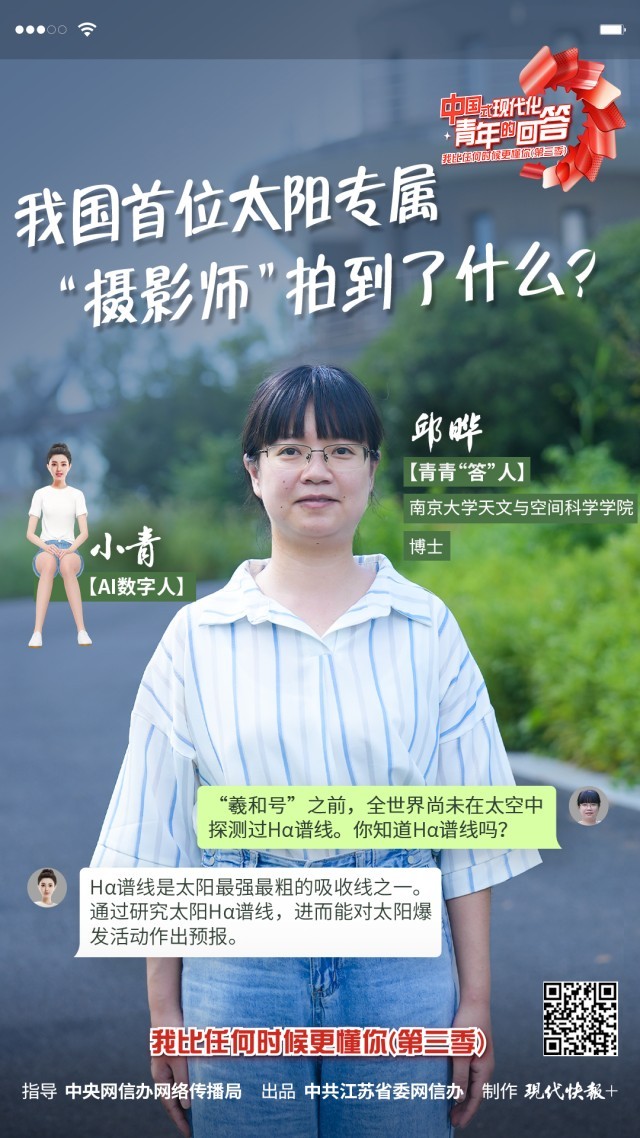 11月7日,“中國(guó)式現(xiàn)代化·青年的回答——我比任何時(shí)候更懂你(第三季)”系列短視頻之《我國(guó)首位太陽(yáng)專(zhuān)屬“攝影師”拍到了什么?》正式上線(xiàn)。本集視頻中,青青“答”人——南京大學(xué)天文與空間科學(xué)學(xué)院博士邱曄和AI數(shù)字人小青,為大家展示了我國(guó)首顆探日衛(wèi)星“羲和號(hào)”拍攝到的畫(huà)面,解釋了“羲和號(hào)”超長(zhǎng)全稱(chēng)里的兩個(gè)關(guān)鍵詞的含義。