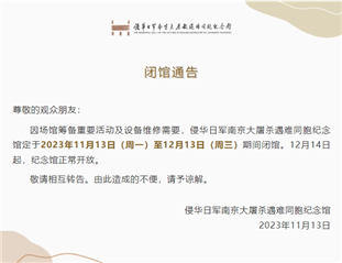 記者從侵華日軍南京大屠殺遇難同胞紀(jì)念館了解到,因場館籌備重要活動及設(shè)備維修需要,該館定于2023年11月13日(周一)至12月13日(周三)期間閉館,12月14日起正常開放。