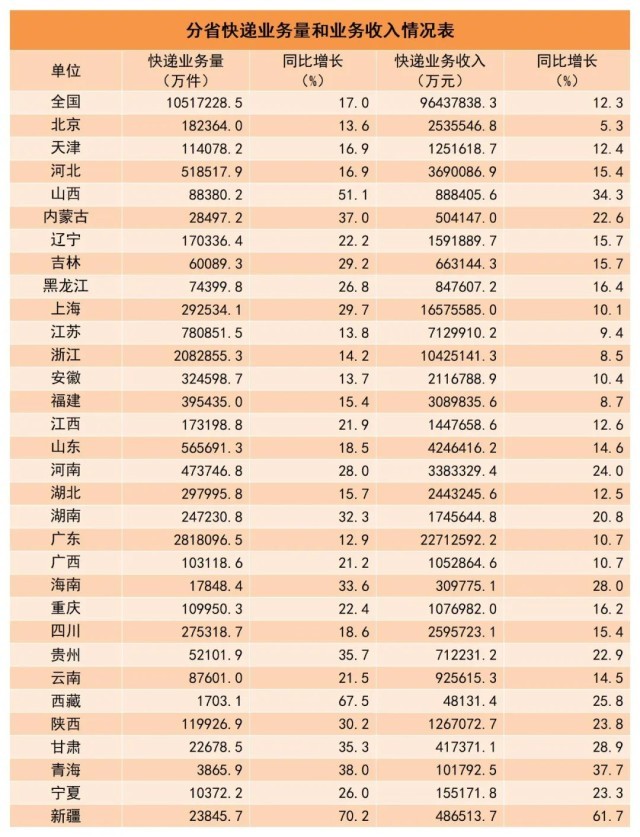 1-10月,同城快遞業(yè)務(wù)量累計(jì)完成108.3億件,同比增長2.7%;異地快遞業(yè)務(wù)量累計(jì)完成919.2億件,同比增長18.2%;國際/港澳臺快遞業(yè)務(wù)量累計(jì)完成24.2億件,同比增長55.1%。