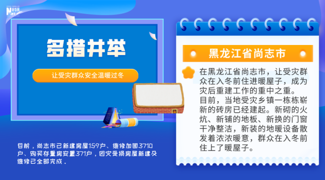 尚志市委書(shū)記劉海濤介紹,目前,尚志市已新建房屋159戶(hù)、維修加固3710戶(hù)、購(gòu)買(mǎi)存量房安置371戶(hù),因?yàn)?zāi)受損房屋新建及維修已全部完成。