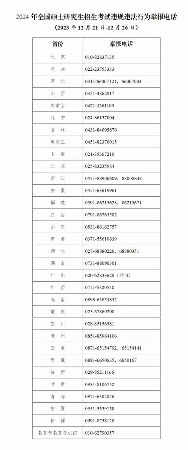 教育部和各?。▍^(qū)、市)教育招生考試機構(gòu)將開通2024年研考舉報電話,考生及社會各界人士可及時舉報反映有關(guān)問題線索。教育部及各?。▍^(qū)、市)將會同有關(guān)部門根據(jù)舉報線索第一時間核查處理,堅決維護風清氣正的研考環(huán)境。