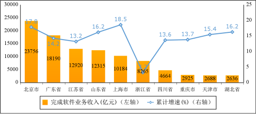 主要軟件大省收入占比持續(xù)提升。1—11月份,軟件業(yè)務(wù)收入居前5名的省份中,北京市,廣東省,江蘇省,山東省,上海市軟件收入分別為23756億元、18190億元、12920億元、12315億元和10184億元,分別增長17.8%、14.2%、13.2%、16.2%和18.5%,五?。ㄊ校┖嫌?jì)軟件業(yè)務(wù)收入77365億元,占全國比重為70%,占比較去年同期提高1.2個百分點(diǎn)。