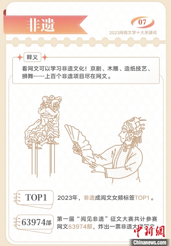 與此同時,網(wǎng)絡(luò)文學(xué)在高質(zhì)量傳承傳統(tǒng)文化方面持續(xù)發(fā)力。京劇、木雕、造紙、獅舞……上百個非遺項目在網(wǎng)文中掀起“傳統(tǒng)文化熱”,“非遺”躍升為閱文女頻標簽TOP1。