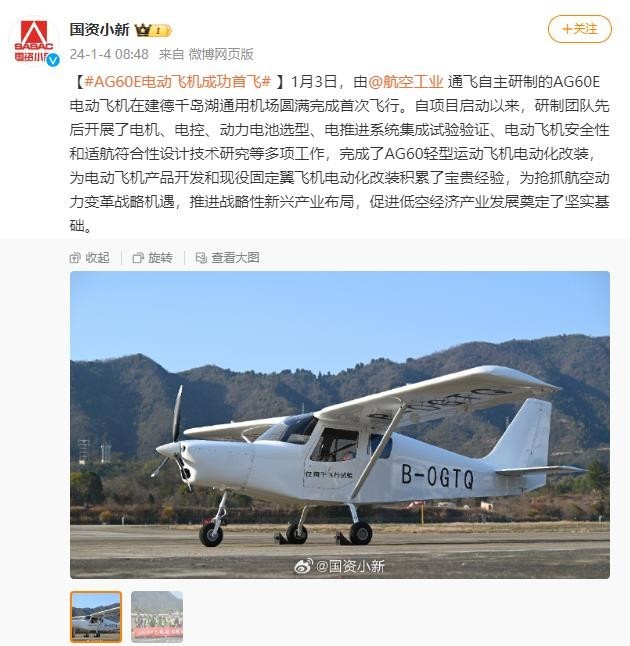 央視網(wǎng)消息:據(jù)@國資小新 消息,1月3日,由@航空工業(yè) 通飛自主研制的AG60E電動飛機在建德千島湖通用機場圓滿完成首次飛行。自項目啟動以來,研制團隊先后開展了電機、電控、動力電池選型、電推進系統(tǒng)集成試驗驗證、電動飛機安全性和適航符合性設計技術研究等多項工作,完成了AG60輕型運動飛機電動化改裝,為電動飛機產品開發(fā)和現(xiàn)役固定翼飛機電動化改裝積累了寶貴經驗,為搶抓航空動力變革戰(zhàn)略機遇,推進戰(zhàn)略性新興產業(yè)布局,促進低空經濟產業(yè)發(fā)展奠定了堅實基礎。