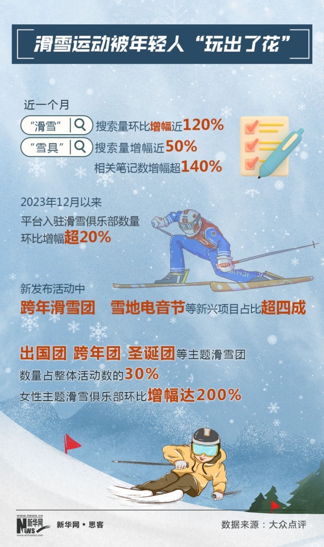 大眾點(diǎn)評(píng)數(shù)據(jù)顯示,2023年12月以來(lái),滑雪俱樂(lè)部入駐數(shù)量環(huán)比增幅超20%。新發(fā)布活動(dòng)中,雪地電音節(jié)、滑雪旅行團(tuán)等新興項(xiàng)目占比超四成?!盎彼阉髁凯h(huán)比增幅近120%,“雪具”搜索量增幅近50%,相關(guān)筆記數(shù)增幅超140%。很多“95后”網(wǎng)友表示,自己一直都想滑雪,在網(wǎng)絡(luò)上看到一些“滑雪+電音節(jié)”的筆記攻略,被這種新穎的形式吸引,立刻“種草”。