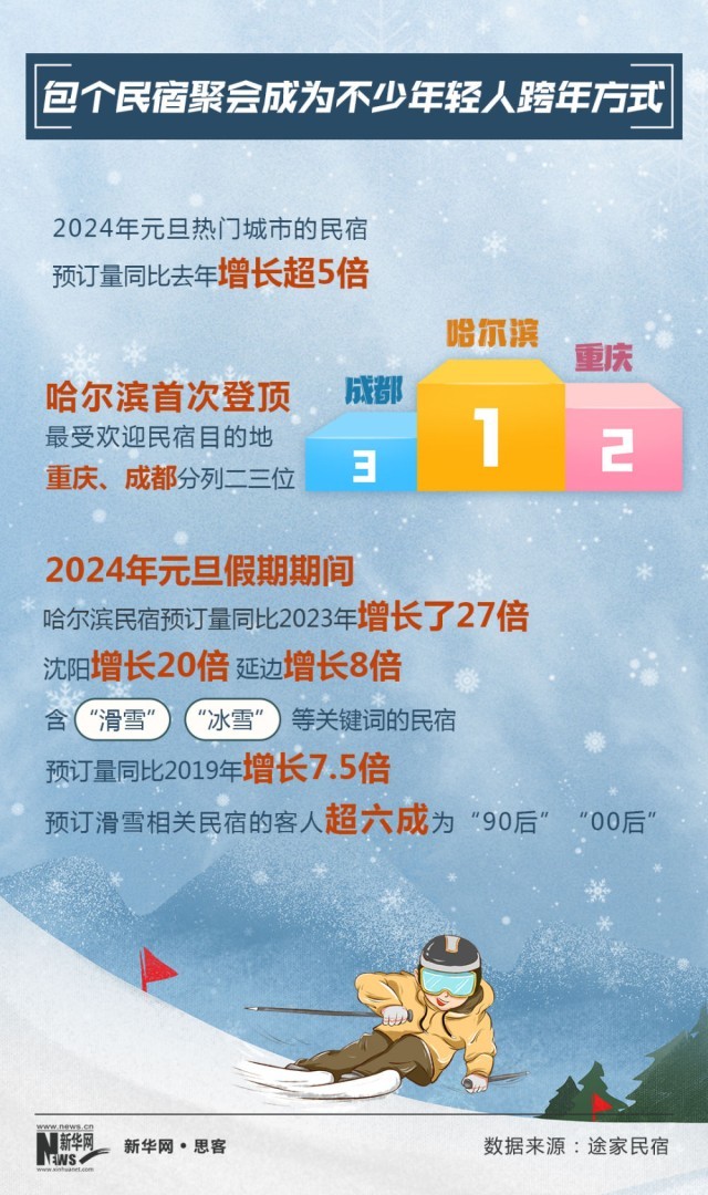 2024年元旦,民宿成為冰雪旅游一大熱詞。2024年元旦熱門(mén)城市的民宿,預(yù)訂量同比2023年增長(zhǎng)超5倍。北方民宿更是強(qiáng)勢(shì)崛起,哈爾濱首次登頂最受歡迎民宿目的地。