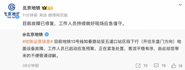北京地鐵:13號線故障已修復(fù)