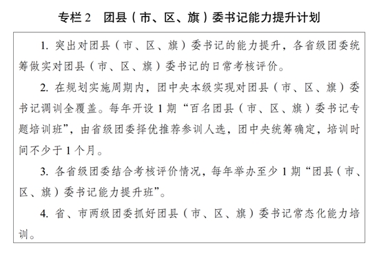 (二)突出“關(guān)鍵少數(shù)”政治訓(xùn)練。堅(jiān)持把政治訓(xùn)練貫穿團(tuán)干部成長全周期,使團(tuán)干部的政治素養(yǎng)、政治能力與擔(dān)負(fù)的領(lǐng)導(dǎo)職責(zé)相匹配。強(qiáng)化“一把手”政治培訓(xùn),有計(jì)劃地選調(diào)團(tuán)的各級領(lǐng)導(dǎo)機(jī)關(guān)主要負(fù)責(zé)同志到團(tuán)干部教育培訓(xùn)機(jī)構(gòu)參加專題培訓(xùn)。強(qiáng)化對團(tuán)縣(市、區(qū)、旗)委書記這一群體的培訓(xùn),實(shí)施團(tuán)縣(市、區(qū)、旗)委書記能力提升計(jì)劃(專欄2)。突出對團(tuán)的領(lǐng)導(dǎo)機(jī)關(guān)干部的政治訓(xùn)練,各級團(tuán)的領(lǐng)導(dǎo)機(jī)關(guān)加強(qiáng)對機(jī)關(guān)干部的常態(tài)化政治能力培訓(xùn)。加強(qiáng)對青年人才的政治引領(lǐng),團(tuán)中央組織部會同有關(guān)單位每年組織一定數(shù)量青年人才開展國情研修。積極推動將地方團(tuán)的領(lǐng)導(dǎo)機(jī)關(guān)班子成員培訓(xùn)納入地方黨委組織開展的干部政治理論培訓(xùn)范疇。