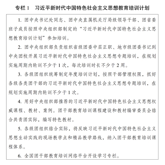 ?。ㄒ唬┚劢咕哿?,久久為功。完善團(tuán)干部理論教育培訓(xùn)長效機(jī)制,落實(shí)黨的創(chuàng)新理論學(xué)習(xí)教育計(jì)劃,組織實(shí)施習(xí)近平新時代中國特色社會主義思想教育培訓(xùn)計(jì)劃(專欄1),系統(tǒng)謀劃、持續(xù)用力,不斷把思想鑄魂、理論武裝工作引向深入。堅(jiān)持把習(xí)近平新時代中國特色社會主義思想作為團(tuán)的各級領(lǐng)導(dǎo)機(jī)關(guān)班子成員理論學(xué)習(xí)中心組學(xué)習(xí)首要內(nèi)容,作出具體安排、精心組織實(shí)施;作為各級團(tuán)干部教育培訓(xùn)機(jī)構(gòu)的主課必修課,辦好理論進(jìn)修班、理論研修班;作為團(tuán)干部學(xué)習(xí)的中心內(nèi)容,全面系統(tǒng)學(xué)、持續(xù)深入學(xué)、聯(lián)系實(shí)際學(xué)。以縣處級及以上團(tuán)干部為重點(diǎn),開展習(xí)近平新時代中國特色社會主義思想和黨的二十大精神集中輪訓(xùn);深入開展主題教育,通過專題學(xué)習(xí)、研討交流、主題黨課、調(diào)查研究、建章立制等形式,推動黨的創(chuàng)新理論學(xué)習(xí)教育走深走實(shí)走心,使廣大團(tuán)干部更加深刻領(lǐng)悟“兩個確立”的決定性意義,更加自覺增強(qiáng)“四個意識”、堅(jiān)定“四個自信”、做到“兩個維護(hù)”。深入開展習(xí)近平總書記關(guān)于青年工作的重要思想學(xué)習(xí)培訓(xùn),使廣大團(tuán)干部學(xué)習(xí)掌握黨的青年工作的地位作用、目標(biāo)任務(wù)、職責(zé)使命、實(shí)踐要求,為做好新時代新征程黨的青年工作打牢思想基礎(chǔ)。
