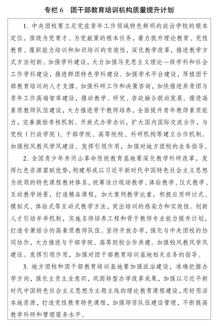 (一)培訓(xùn)機(jī)構(gòu)建設(shè)。加強(qiáng)團(tuán)干部教育培訓(xùn)機(jī)構(gòu)規(guī)范管理和質(zhì)量提升,推進(jìn)各級團(tuán)校、團(tuán)干部教育培訓(xùn)基地建設(shè),構(gòu)建以中央團(tuán)校、全國青少年井岡山革命傳統(tǒng)教育基地為龍頭,各級團(tuán)校、團(tuán)干部教育培訓(xùn)基地相互補(bǔ)充、布局合理、規(guī)范有序的培訓(xùn)機(jī)構(gòu)體系,強(qiáng)化中央團(tuán)校對地方團(tuán)校的業(yè)務(wù)指導(dǎo),不斷提高辦學(xué)水平。加強(qiáng)各類團(tuán)干部教育培訓(xùn)機(jī)構(gòu)規(guī)范管理,開展團(tuán)干部教育培訓(xùn)機(jī)構(gòu)辦學(xué)質(zhì)量評估。支持各地各級團(tuán)組織聯(lián)合開展培訓(xùn),鼓勵團(tuán)干部教育培訓(xùn)機(jī)構(gòu)開展區(qū)域協(xié)作交流,推動優(yōu)質(zhì)培訓(xùn)資源共建共享。實(shí)施團(tuán)干部教育培訓(xùn)機(jī)構(gòu)質(zhì)量提升計(jì)劃(專欄6)。