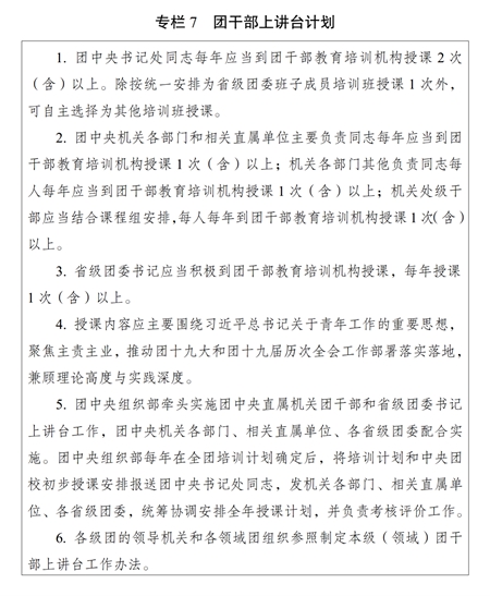 (二)師資隊(duì)伍建設(shè)。加大名師培養(yǎng)引進(jìn)力度,把團(tuán)干部教育培訓(xùn)師資納入各級青年人才政策支持范疇,努力造就一批對黨忠誠、精通黨的創(chuàng)新理論、授課水平高、在學(xué)科領(lǐng)域有影響力的知名教師。加強(qiáng)師資隊(duì)伍黨性教育和業(yè)務(wù)培訓(xùn),完善專職教師通過列席會議、基層調(diào)研、掛職鍛煉等方式促進(jìn)知識更新、加深理論研究。通過“名師帶徒”等方式,加強(qiáng)中青年骨干教師培養(yǎng)。大力推進(jìn)團(tuán)干部上講臺,實(shí)施團(tuán)干部上講臺計(jì)劃(專欄7)。注重在領(lǐng)導(dǎo)干部、先進(jìn)青年典型、優(yōu)秀基層團(tuán)干部中遴選培養(yǎng)師資。分級建設(shè)師資庫。探索建立符合團(tuán)干部教育培訓(xùn)特點(diǎn)的師資隊(duì)伍考核評價體系。