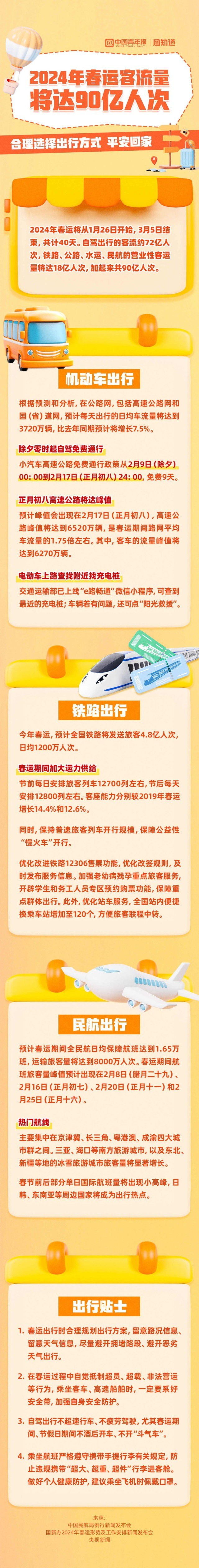 2024年春運將從1月26日開始,全社會跨區(qū)域人員流動量將創(chuàng)歷史新高。春運期間:①除夕零時起自駕免費通行;②鐵路全國站內(nèi)便捷換乘車站增加至120個;③民航國內(nèi)熱門航線集中在京津冀、長三角、粵港澳、成渝四大城市群之間。你會選擇那種方式回家過年?點擊長圖,一起了解春運出行保障。
